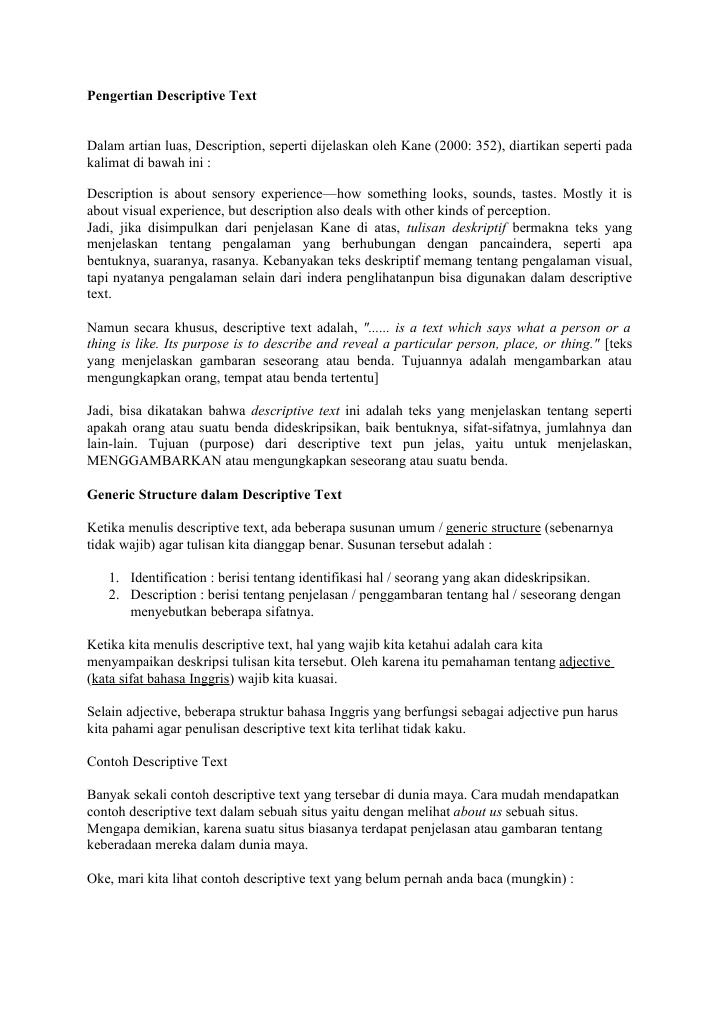 22+ Contoh Teks Deskripsi Dalam Bahasa Inggris. Tulisan descriptive text memiliki isi mengenai deskripsi pada suatu benda, lokasi benda, sifat dari benda itu, karakteristik benda, bentuk. Generic … continue reading '10 contoh descriptive text dalam bahasa inggris'.