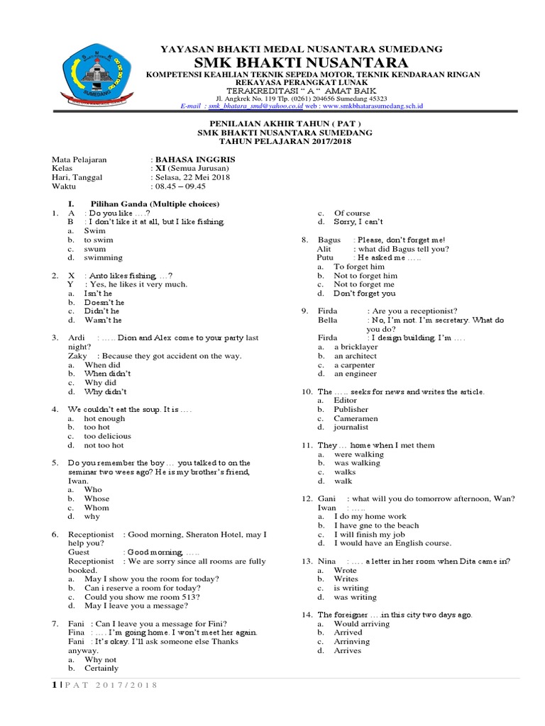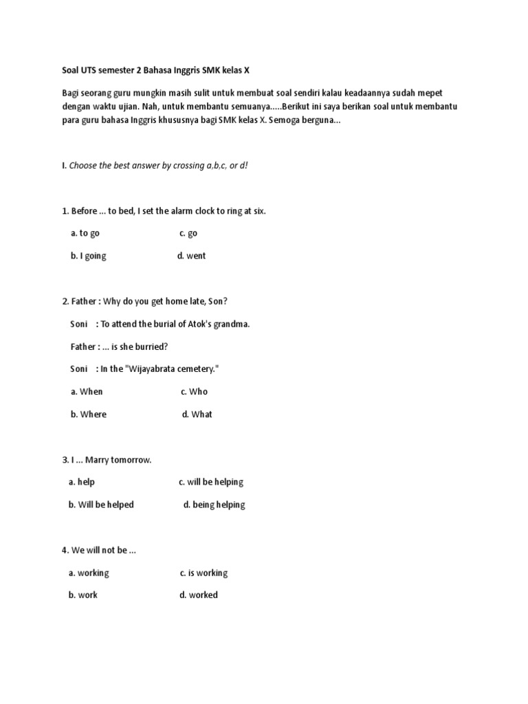 Contoh soal bahasa inggris kelas x semester 1 kurikulum 2013 beserta jawabannya ~ pilihan ganda. Berikut ini adalah rincian soal uts bahasa inggris kelas 10 sma/ma. Dengan adanya edutore, buku soal bahasa inggris sma kelas 10 yang selama ini diakses secara fisik, kini dapat diakses juga dengan web dan aplikasi sehingga belajar dapat dilakukan di mana saja dan kapan saja. 100%(25)100% menganggap dokumen ini bermanfaat (25 suara).