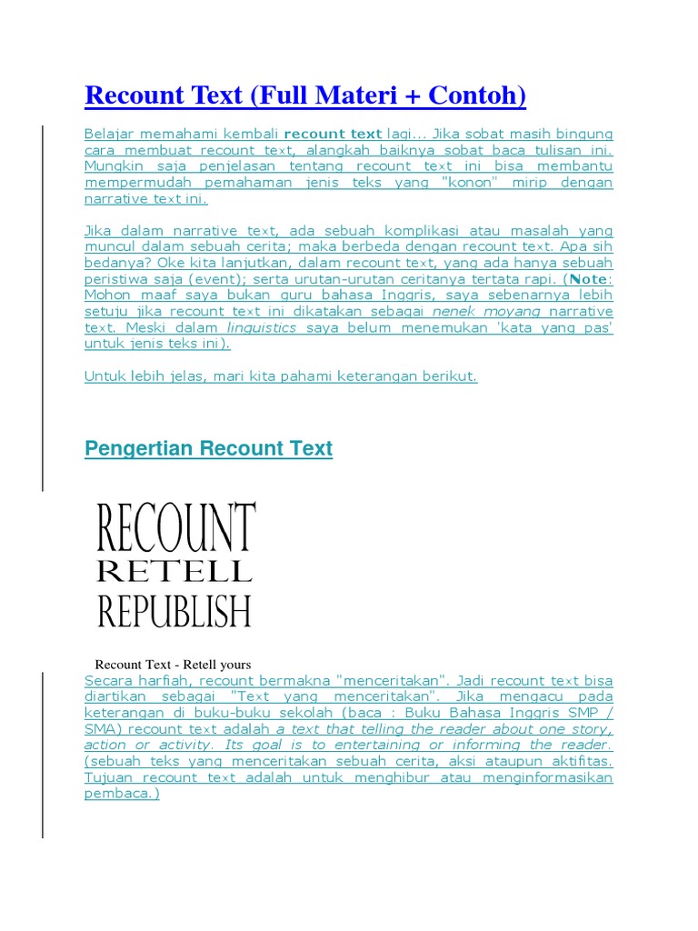 Contoh Teks Recount Dalam Bahasa Inggris - Berbagi Teks ... from imgv2-1-f.scribdassets.com Tahukah anda bahwa jenis teks didalam bahasa inggris ada 13 ? Ada beberapa macam jenis text yaitu: Recount text merupakan teks bacaan yang berisi mengenai cerita atau runtutan sebuah kejadian atau pengalaman yang terjadi di masa lampau.