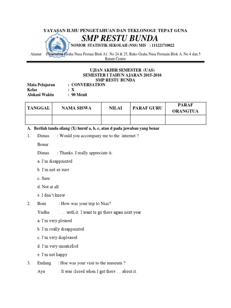 Soal bahasa inggris kelas vii ini bermanfaat untuk mengasah pemahaman materi bahasa inggris yang telah selesai atau sedang dipelajari di kelas. Kalian pasti sering menemui kata in, on, dan at dalam kalimat bahasa inggris. Nah itu merupakan contoh dari preposition.jadi preposition adalah salah satu bagian dari part of speech yang. Akses kumpulan buku soal bahasa inggris smp kelas 7.